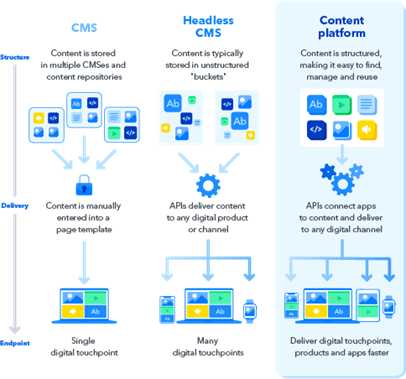 Num CMS tradicional, a definição, criação e apresentação de conteúdos habitam o mesmo sistema. Num Headless CMS, a definição e criação são separadas da apresentação dos conteúdos, e a comunicação entre as duas camadas é feita através de APIs (Application Programming Interface). Desta forma, a apresentação de conteúdos pode ser replicada em diferentes websites.